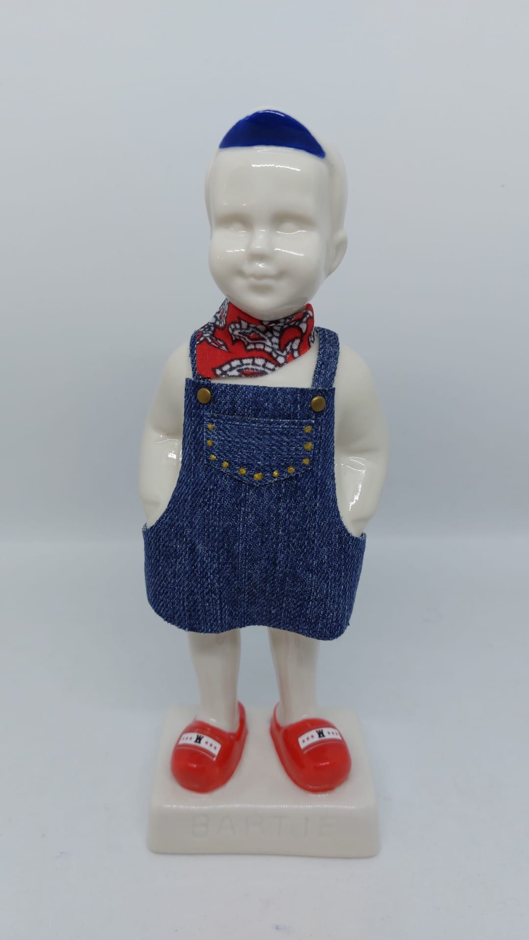 Bartje in spijkerbroek met rode klompjes met een opdruk van de Drentse vlag